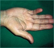 Dabei handelt es sich um eine Bindegewebsveränderung, die sich unter der Haut in Form von Knoten und derben Strängen entlang einer fächerförmigen Sehnenplatte in der Hohlhand (Palmaraponeurose) entwickelt. Eine Schrumpfung dieser Platte führt zur typischen Streckhemmung der Finger.